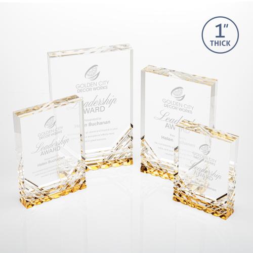 Celebrate success and mark milestones with the prestigious Macdonald Gold Rectangle Acrylic Trophy. This exquisite award's thick, freestanding, crystal-clear acrylic silhouette is complemented by a radiant gold accent at the base, offering a sense of depth and elegance. Casting a warm golden hue through its intricate cuts, the trophy creates a stunning prismatic effect, enhancing your personalized message of recognition. Ideal for corporate awards, leadership recognition, or any celebratory occasion, this rectangular trophy stands as a symbol of achievement and appreciation. Please note, customization adds a personalized touch to each blank, pristine surface to meet your specific award needs.