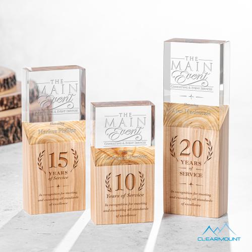 Celebrate milestones with timeless elegance - the Plante Towers Wood Trophy epitomizes prestige and appreciation. This graceful award combines the natural warmth of a slanted wooden column with a sleek, clear acrylic top, creating a harmonious blend of materials. Ideal for honoring Years of Service, employee achievements, or any significant corporate milestone, this trophy is designed not just to recognize, but to impress. Its tower-like shape exudes strength and success, while the impeccable clarity of the acrylic allows for personalized messages to shine through. Crafted with care from high-quality wood and acrylic, this award stands as a remarkable testament to dedication and excellence. Whether displayed on a shelf, desk, or in a trophy case, the Plante Towers Wood Trophy will be a cherished emblem of achievement for years to come.