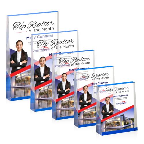 Celebrate excellence and acknowledge success with the Hurtado Full Color Blue Rectangle Acrylic Trophy. This exquisite award boasts a sleek and modern design, consisting of a thick, freestanding acrylic that gracefully tapers towards the top, providing a generous area for personalization. Vibrant and eye-catching, the vivid full-color print backdrop is tailor-made to showcase your custom message or logo, making it a perfect choice for recognizing top performers in the real estate sector or any field where distinction is key. The trophy is available in a vertical orientation, ensuring your accolades stand tall. Whether for 'Top Realtor of the Month' or any prestigious honor, this trophy is designed to convey appreciation with lasting impact.