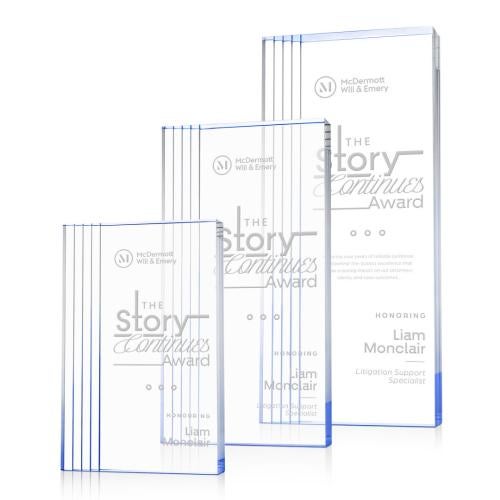 The Haverton Blue Rectangle Acrylic Trophy is a distinguished choice for honoring exceptional achievements in any corporate setting. This sleek, freestanding award features a modern tall-rectangle silhouette with distinctive stepped, layered edge detailing, adding both depth and elegance. Its wide, crystal-clear face is perfect for showcasing personalized messages or logos, while the precision-polished acrylic reflects light beautifully, creating a clean and premium appearance. Available in Clear, Gold, or Sapphire accents, the Haverton Trophy stands out as an impressive symbol of service, leadership, or milestone accomplishments, making it an ideal recognition piece for any celebration.