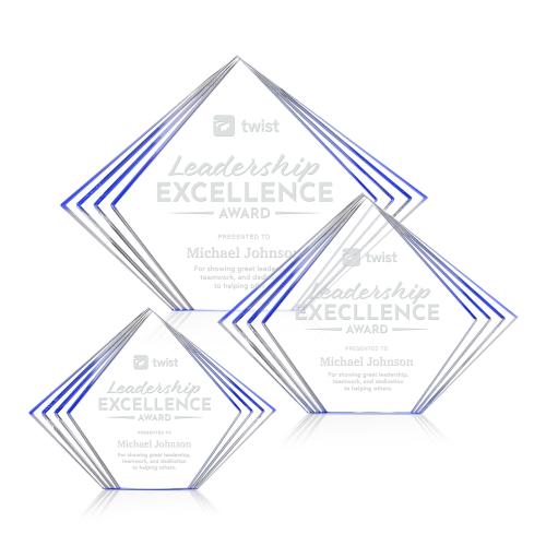 The Crawford Blue Acrylic Trophy is an elegant and modern recognition piece, ideal for celebrating exceptional achievements. Its sleek, diamond-shaped design features layered side accents that add depth and visual interest, ensuring it stands out in any setting. Expertly crafted from high-quality clear acrylic, this trophy offers a spacious area for custom decoration with full-color graphics, logos, or personalized messages, making it a versatile choice for any corporate event or awards ceremony. The Crawford Trophy not only captures attention with its contemporary style but also perfectly honors those who excel in their field.