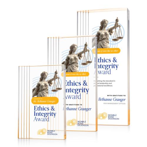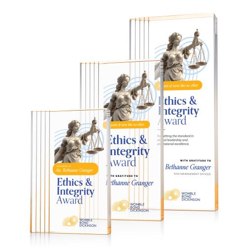 The Haverton Acrylic VividPrint Award is a sleek, freestanding recognition piece with a modern tall-rectangle silhouette and a distinctive stepped, layered edge detail that adds depth and dimension along one side. Its wide, crystal-clear face is designed to showcase your message, while the precision-polished acrylic catches light for a clean, premium look. Available in Clear, Gold, or Sapphire accents, the Haverton makes a striking statement for service, leadership, or milestone awards. Bring your artwork to life with full-color VividPrint!
