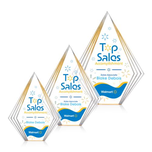 The Brantley Full Color Gold Acrylic Trophy is a stunning choice for those seeking a unique and memorable award. Its tall diamond shape, accented by multi-layered, stepped edges, creates a captivating sense of depth and reflection. Ideal for recognizing top sales, leadership, and milestone achievements, its clean, open center serves as the perfect canvas for your custom engraving or vibrant full-color artwork. The modern beveled acrylic frame adds a touch of architectural elegance, available in Clear, Gold, or Sapphire accents to suit any occasion. Celebrate success with the Brantley Trophy and bring your recognition to life with vivid color and style.