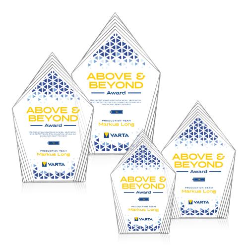 The Greyson Full Color Clear Peaks Acrylic Trophy is a stunning choice for celebrating excellence and achievement. With its modern geometric design and layered peaks, this award offers a sleek, dimensional appearance that stands out. Crafted from premium clear acrylic, it boasts exceptional clarity and a polished finish that underscores its high-end appeal. Ideal for recognizing corporate milestones or personal achievements, the Greyson Trophy allows your logo to shine with its full-color VividPrint capabilities. Elegant yet bold, this timeless piece is designed to make a lasting impression and serve as a proud symbol of success.