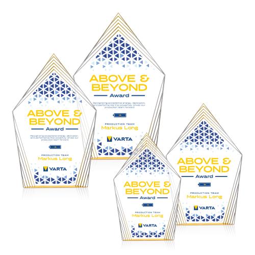 Introducing the Greyson Full Color Gold Peaks Acrylic Trophy, a stunning recognition piece that merges modern elegance with high functionality. This exquisite award showcases layered geometric contours, creating a dimensional effect that adds depth and sophistication. Crafted from premium clear acrylic, it offers exceptional clarity and a refined, polished finish. Whether celebrating corporate achievements or recognizing exceptional performance, the Greyson Trophy makes a bold, timeless statement. With the option for vivid, full-color customization, your logo and message will stand out beautifully, ensuring the award is as memorable as the accomplishment it signifies.