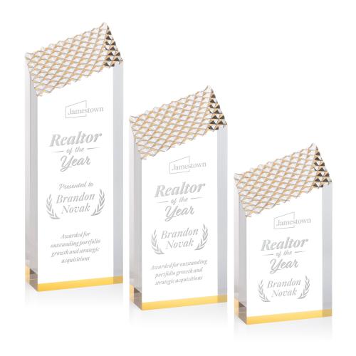Introducing the Paluzzi Gold Peaks Acrylic Trophy, a sophisticated accolade designed to make every achievement shine. This modern piece features a sleek, vertical shape crowned with an elegant angled, faceted texture, subtly accented in gold for enhanced visual impact. Crafted from high-quality acrylic, its contemporary design is complemented by a refined gold accent at the base, ensuring it stands out beautifully in any setting. Ideal for corporate awards, this trophy offers a perfect blend of clean lines and elevated detail, making it a memorable tribute to hard-earned success and excellence. Personalize it to celebrate your achievers with a touch of elegance.