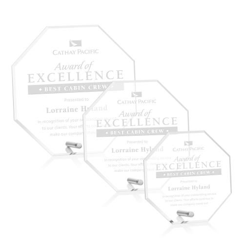 Celebrate outstanding achievements with the Jewell Octagon Silver Polygon Acrylic Trophy, an elegant and contemporary award designed to recognize excellence and success. Crafted from premium acrylic, this trophy showcases a sleek octagonal polygon shape with beautifully beveled edges, providing a multidimensional reflective effect. Standing upright with a tasteful silver or gold easel pin, it makes for a striking display on any desk or shelf. The trophy's clear, unadorned surface is perfect for custom inscriptions, allowing you to personalize with names, logos, or messages, ensuring that each award is as unique as the accomplishment it honors. Affordable yet sophisticated, the Jewell Octagon Acrylic Trophy is an ideal choice for employee recognition, corporate milestones, or any special occasion that calls for a lasting symbol of appreciation.