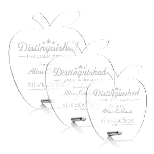 Honor educational excellence with the Jewell Apple Silver Acrylic Trophy, uniquely designed to celebrate the tireless dedication of teachers and academic professionals. Shaped as a classic symbol of teaching-the apple-this crystal-clear acrylic award sits elegantly upright, supported by a sleek silver easel pin for easy display. Its unblemished surface starts as a perfect canvas for personalized engravings, allowing you to inscribe heartfelt messages or accolades. This tasteful piece not only serves as a meaningful memento but also adds a touch of sophistication to any desk or bookshelf. Present the Jewell Apple Silver Acrylic Trophy to express gratitude and acknowledge the inspirational impact of those shaping minds in the educational field.