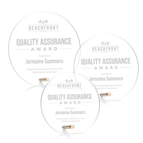 Celebrate excellence with the elegant simplicity of the Jewell Gold Circle Acrylic Trophy. This modern award seamlessly combines form and function, featuring a sleek, beveled circle crafted from high-quality acrylic that captures light with a radiant clarity. The trophy's unique clipped bottom gives it a distinct edge, while the lustrous gold easel pin provides a secure stand and a touch of sophistication. Ideal for commending outstanding achievements or marking significant milestones, this trophy can be effortlessly personalized to create a lasting impression. Practical yet stylish, the Jewell Gold Circle Acrylic Trophy is an affordable solution for recognizing commitment and success in any professional setting.
