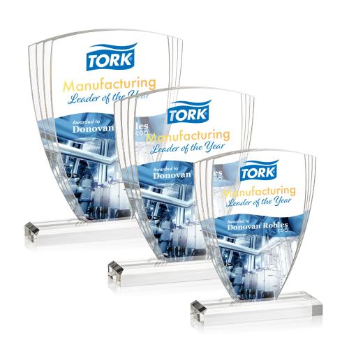 Celebrate outstanding achievements with the Locke Full Color Peaks Acrylic Trophy, a symbol of excellence and distinction. Its captivating triple-stepped winged accents and peak design soar upwards, embodying the pinnacle of success. The acrylic material ensures a crystal-clear display, creating a lasting impression for any recipient. This trophy stands as a bold and unique piece, perfect for commemorating special milestones, top performers, or leadership accolades. With customizable options, each trophy begins as a blank canvas, ready to be personalized to honor the achievements of the deserved. Recognize the extraordinary with this stunning representation of triumph.