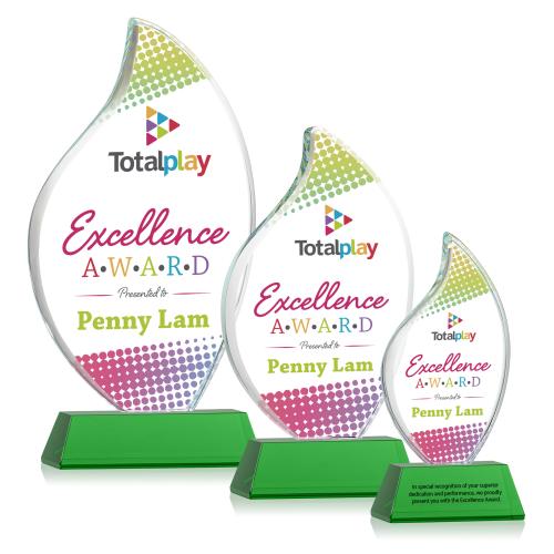 Ignite the spirit of triumph with the Teague Vividprint™ on Helton Green Flame Crystal Trophy. Crafted from a substantial 3/4" thick Starfire Crystal, this captivating flame-shaped award symbolizes passion, energy, and accomplishment. It stands elegantly atop a choice of clear or colored Optical Crystal Newhaven Base, designed to reflect the recipient's towering achievement. The full-color VividPrint allows your logo and personalized message to shine brilliantly, ensuring a memorable and distinct recognition. Each trophy is thoughtfully presented in a black satin-lined gift box, making it an exceptional piece for celebrating momentous events. With optional second position imprint, this trophy is as versatile as it is stunning, perfect for acknowledging excellence and outstanding contributions in any field. Please note that the product starts as a blank canvas, ready to be customized to your specification.