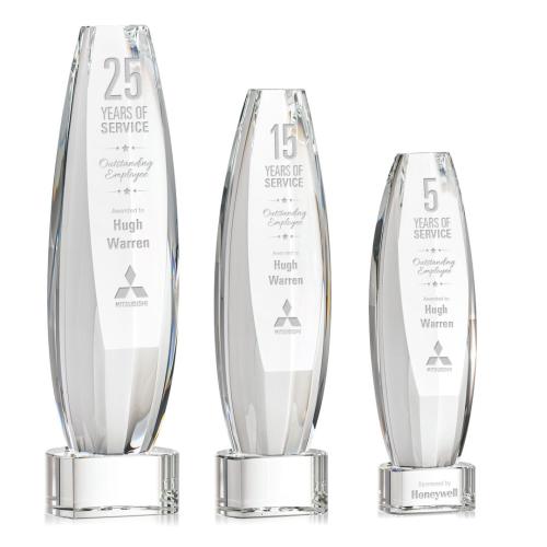 Introducing the Hoover on Half Round Base Clear Towers Crystal Trophy, a stunning paragon of recognition and prestige. Expertly made from polished optical crystal, this trophy glistens with a brilliance that commands attention and celebrates exceptional achievement. Its sleek tower design soars upwards, symbolizing the ascension to greatness, while the large flat face provides a generous canvas for personalized engraving, ensuring that every commendation is as unique as the recipient. The trophy rests on a choice of a clear, emerald, sapphire, or ebony half-round base, offering a hint of subtle color or classic elegance to complement any decor. Arriving in a luxurious black satin-lined presentation gift box, this crystal trophy stands as a timeless gesture of appreciation that is both substantial and visually captivating.