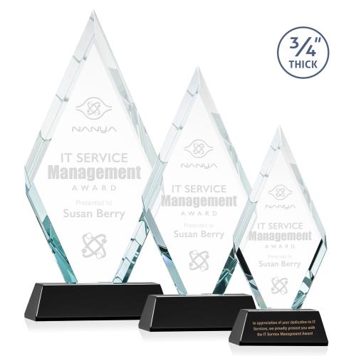 Celebrate achievements with the timeless elegance of the Richmond on Helton Base Black Diamond Crystal Trophy. Crafted from premium Starfire Crystal, this award features stunning interchanging beveled edges that catch the light for a radiant display. Its unmistakable diamond shape rests on a sophisticated, tapered crystal base available in eight distinct colors to complement any corporate or personal milestone. Optional second position etch and colorfill on the base allow for further personalization, ensuring each award is as unique as the achievements it honors. At ¾ inch thick, this crystal trophy stands as a robust symbol of recognition and appreciation for exceptional accomplishments.