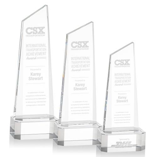 Elevate the recognition of stellar achievements with the Bishop Tower on Cornered Base Clear Peaks Crystal Trophy. Crafted from the finest optical crystal, this stately award stands as a symbol of excellence and ambition with its ascending peak design and slanted top, meticulously accentuated by deep, precise bevels. The clear crystal base, available in various tints such as sapphire, emerald, ebony, or classic clear, provides a sturdy and elegant foundation that can be further personalized with an optional second etch position. Whether for corporate recognition, academic honors, or distinguished service awards, this crystal trophy epitomizes prestige and is sure to inspire greatness in any recipient. Please note, while the product image may show sample personalization, all items are supplied blank, ready to be customized to celebrate each unique accolade.