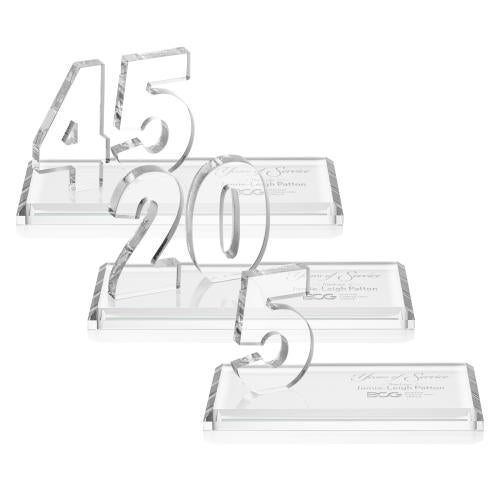 The Hutchison Anniversary Clear Crystal Trophy is a splendid testament to employee dedication and loyalty, perfect for commemorating milestone anniversaries. Each trophy is expertly crafted from premium Starfire Crystal, exuding elegance and clarity. The numbers, signifying years of service ranging from 5 to 50 years, are boldly fashioned in an eye-catching 3D design, mounted on a choice of a pristine clear or tastefully colored crystal base. Designed to shine and inspire, this timeless piece not only honors commitment but also serves as an exquisite decorative item. Custom engraving options are available to personalize and enhance the emotional value of this high-quality recognition award.