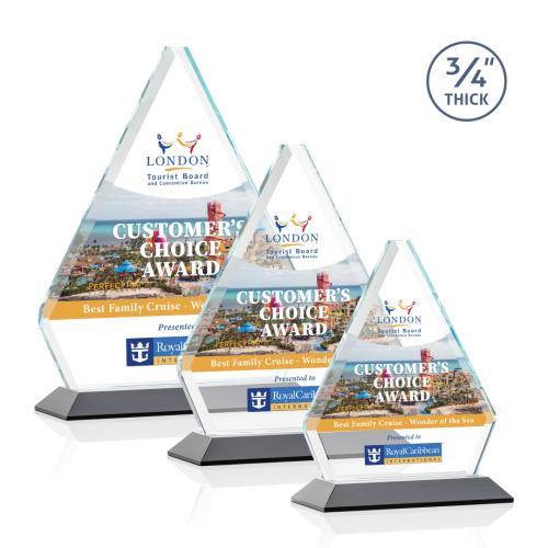 Commend the pinnacle of success with the Mayer Full Color Black Diamond Crystal Trophy, an exceptional accolade for extraordinary accomplishments. Crafted from premium Starfire Crystal, this trophy is designed to celebrate achievements with grandeur and elegance. The distinctive diamond shape symbolizes durability and brilliance, while the masterfully beveled edges capture and reflect light, creating a mesmerizing display. Resting on a robust mitered base available in nine vibrant colors, this trophy offers a full-color customization option, allowing you to personalize your message of appreciation or branding with vivid detail. Standing 3/4" thick, it is a substantial and prestigious award that will be treasured by any recipient. Whether acknowledging individual excellence or team achievements, this crystal trophy is sure to leave a lasting impression.