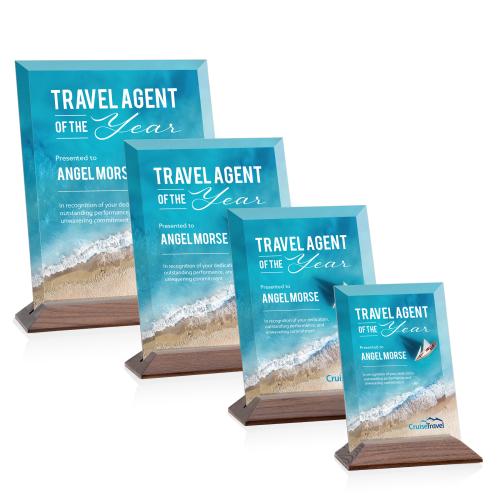 Celebrate excellence and convey sincere appreciation with the Salgado Full Color Starfire/Walnut Rectangle Crystal Trophy, a symbol of distinction and prestige. This elegantly crafted award features the luminous clarity of Starfire Crystal, perfectly complemented by a rich walnut base, offered in both horizontal and vertical orientations to suit your display preferences. The crystal's beveled edges catch the light, illuminating its deep full-color customization, which is expertly baked to ensure it remains a vibrant homage to achievement for years to come. Whether it's to honor a 'Travel Agent of the Year' or to mark any significant corporate milestone or personal achievement, this trophy's sleek rectangle design proves an excellent canvas for personalized messages and logos, making it a truly memorable keepsake.