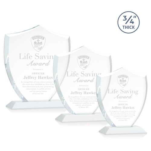 Honor bravery and dedication with the Escamilla Shield Fagan Unique Crystal Trophy, an emblematic award designed specifically to celebrate the valor of first responders and law enforcement personnel. Crafted from radiant Starfire Crystal, this award shimmers with clarity and features a commendable shield shape that resonates with notions of protection and steadfastness. The beveled edges add a touch of sophistication to the design, while the mitered optical crystal base provides a robust and stable foundation, ensuring the trophy stands out prominently on any mantel or display cabinet. Whether it's to recognize life-saving acts or to commend exemplary service, this unadorned crystal trophy awaits your personalized touch to create a lasting symbol of esteem and recognition.