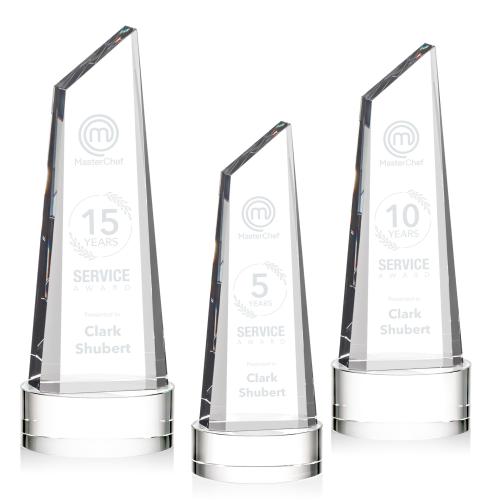 Celebrate success and commend achievement with the Keene on Base Clear Peaks Crystal Trophy, a symbol of excellence and a beacon of prestige. This captivating award, crafted from the purest optical crystal, features a trapezoidal tower design that ascends majestically to form an elegant peak. Demonstrating skillful craftsmanship, the trophy is securely anchored on a sturdy crystal base available in your choice of classic Clear, vibrant Emerald, sophisticated Ebony or the deep hues of Sapphire, ensuring a personalized touch to match your ceremonial theme. Each facet of this stunning piece reflects light beautifully, creating a dazzling display that captivates from every angle. Perfect for service awards, corporate recognition, or as a distinguished gift, this crystal trophy can be customized with engraving to honor the extraordinary achievements of its recipient. With the Keene on Base Clear Peaks Crystal Trophy, you are not just giving an award; you are providing an enduring symbol of excellence that will be cherished for years to come.