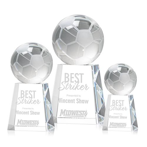 Celebrate the spirit and artistry of soccer with our exquisite Soccer Ball Globe on Medium Base Crystal Trophy. This striking award features a meticulously crafted optical crystal soccer ball, poised atop a sleek and sturdy base. The ball's faceted surface brilliantly catches and refracts light, creating a stunning visual effect that symbolizes the dynamism and glory of the sport. The base provides ample space for custom engraving, perfect for personalizing with a team logo, recipient's name, or a message of triumph and recognition. Whether presented at tournaments, to a coach, or as a special keepsake, this trophy is an ideal way to honor the achievements and passion of soccer enthusiasts.
