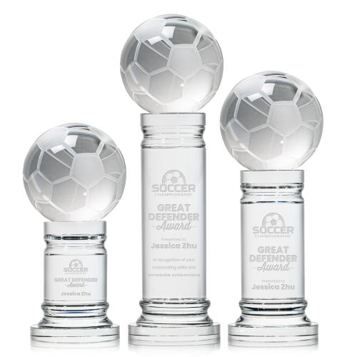 Celebrate the spirit and artistry of soccer with the exquisite Soccer Ball Globe on Pedestal Base Crystal Trophy. Meticulously crafted from the purest Optical Crystal, this trophy features a beautifully detailed soccer ball perched atop a sleek pedestal base, poised as if capturing the dynamic essence of the game. Every facet is designed to reflect light, symbolizing the sparkling achievements of its recipients. The base offers ample space for personalization, making it the perfect canvas to engrave a team logo, a player's name, or a heartfelt message. This elegant award stands as a testament to individual and team successes, ideal for commemorating tournaments, player recognition, or as a sophisticated gift for the soccer aficionado in your life.