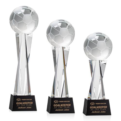 Honor the art of the beautiful game with the Soccer Ball on Saldana Base Black Globe Crystal Trophy, designed to reflect both the spirit and elegance of soccer. This trophy features a meticulously crafted optic crystal globe, intricately detailed to resemble a soccer ball, poised on a sleek columnar pedestal which ascends from a robust black crystal base-the perfect canvas for personalized engravings. Whether awarded to a star player, a dedicated coach, or as a token of appreciation at soccer events, this stunning piece captures the dynamic essence of the sport and serves as a lasting memento of excellence and achievement. Every facet of the crystal soccer ball is engineered to catch and dance with the light, creating a spectacular centerpiece that ensures each recipient feels like a champion.