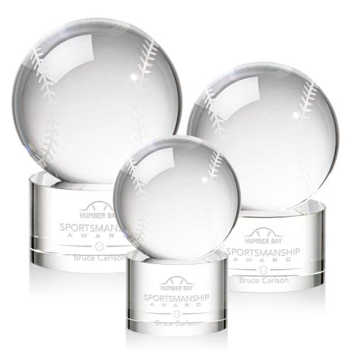 Celebrate the spirit of America's favorite pastime with the Baseball Globe on Round Base Crystal Trophy. Expertly crafted from the finest optical crystal, this trophy beautifully captures the essence of baseball with its detailed globe design. The baseball sits elegantly atop a sturdy, polished round base, which provides ample space for personalized engraving, making it the perfect customizable piece for recognizing individual achievements or team victories. Whether it's for a championship tournament, a coach's retirement gift, or a cherished keepsake for a dedicated fan, this award is bound to be a home run with recipients who appreciate the timeless allure of the game and the brilliance of crystal artistry.