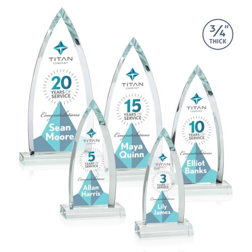 Celebrate milestones and accolades with the Valdes Full Color Starfire Peaks Crystal Trophy, a symbol of achievement and brilliance. Each award is masterfully crafted from premium Starfire crystal, forming an elegant arrowhead silhouette with pronounced dramatic bevels to capture light and attention. Standing proudly on a crystal base, this 3/4" thick trophy comes to life with our VividPrint full-color process, allowing for personalized messages, logos, or artwork to stand out with exceptional clarity. Whether for a service award, team victory, or corporate recognition, this trophy offers the option for a second position etch, making it a versatile and distinguished choice for any celebratory event. With its striking design and pristine quality, the Valdes Starfire Trophy is sure to command a place of pride in any recipient's collection.