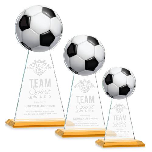 Celebrate soccer achievements with the Edenwood Soccer Amber Towers Crystal Trophy, a prestigious award that embodies both elegance and spirit of the sport. Crafted from radiant Starfire Crystal, this trophy's eye-catching design features gracefully sloping sides rising to a finely detailed soccer ball, capturing the essence of the game atop its summit. Perfect for players, coaches, and dedicated team members alike, it stands as a testament to skill, perseverance, and teamwork. Personalize this fine piece by choosing from eight distinct base colors to match your team or event theme, ensuring every recipient feels uniquely honored by this stunning token of recognition. With its combination of sophisticated design and customization, the Edenwood Soccer Amber Towers Crystal Trophy is an ideal way to commemorate victories, milestones, and the love of the game.