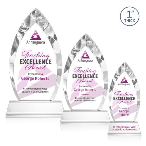 Honor achievements with the splendid Marinello Full Color on Base Clear Peaks Crystal Trophy, a symbol of excellence and sophistication. Crafted from premium quality crystal, this award features striking peak shapes, designed to catch and refract light, creating a dazzling display from every angle. The unique color crystal accent enhances the base, offering a choice of eight vibrant colors to complement your organization's branding or the theme of your event. This trophy is customizable, allowing you to add a personalized touch for the recipient. With the optional second position on the base, there is even more room for your message of appreciation. Each trophy arrives in a posh black satin-lined gift box, making it a ready-to-present token of recognition that is sure to leave a lasting impression.