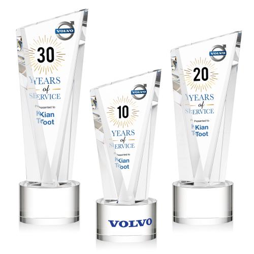 Celebrate exceptional achievements with the Maher Full Color on Round Base Clear Peaks Crystal Trophy, a symbol of distinction and excellence. Its striking angular design boasts a slanted summit and pronounced bevels cascading elegantly to forge a captivating display. A beacon of success, this freestanding crystal trophy is designed to bring your personalized message to life with a vivid full-color imprint that stands out against the translucent clarity of the crystal. The round base serves as a sturdy foundation and can optionally bear a second-position decoration for enhanced customization. Ideal for commemorating milestones, recognizing top performers, or honoring years of dedicated service, this pristine crystal piece promises to leave a lasting impression on any recipient.