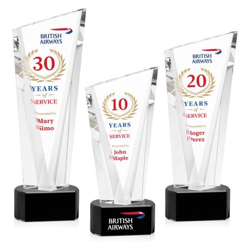 Celebrate exceptional achievements with the Maher Full Color on Half Round Base Black Peaks Crystal Trophy, a prestigious symbol of recognition. This exquisite crystal award features an innovative design with angular black peaks rising to meet a slanted top, creating a dynamic interplay of light and shadow. The thick bevels overlapping at the base offer a visually stunning base for personalized messages and accolades. With full-color VividPrint capabilities, any inscription, logo, or design is amplified to stand out with impressive clarity and vibrancy against the crystal. Optional second-position decoration on the base allows for further personalization. This freestanding trophy is not only a magnificent centerpiece to any award ceremony but a timeless keepsake that honorees will cherish forever.