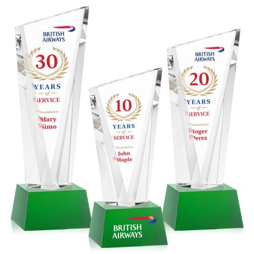 Celebrate achievements with the elegant Maher Full Color on Small Base Green Peaks Crystal Trophy, a masterpiece of recognition. Crafted from the finest crystal, this award boasts an impressive angular design with overlapping thick bevels and a striking slanted top that catches the light, embodying excellence and success. The vibrant full-color VividPrint allows personalized messages to truly stand out, making it an ideal choice for commemorating milestones, expressing gratitude, or honoring exemplary service. Resting on a bold green base, this trophy offers an option for a second-position decoration, providing additional space for customization. It is a tangible symbol of accomplishment that is as remarkable as the achievements it celebrates. Perfect for corporate events, sports ceremonies, and special recognitions, this trophy is designed to be a lasting tribute to high performers and notable successes.