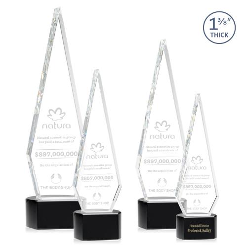 Elevate your recognition program with the exquisite Cullen on Half Round Base Black Polygon Crystal Trophy. Skillfully crafted from the highest quality optical crystal, this award features a distinctive polygon shape with a robust 1 3/8 inch thickness, conveying both strength and elegance. The tall diamond-shaped trophy captures and refracts light, emphasizing the award's stunning clarity and the precision of its cut edges. Resting on a sleek half-round black base, the trophy promises to be a prestigious centerpiece. Add a personalized touch to celebrate achievements with optional 2nd position etching, making it the perfect symbol of excellence for top performers and distinguished honorees.