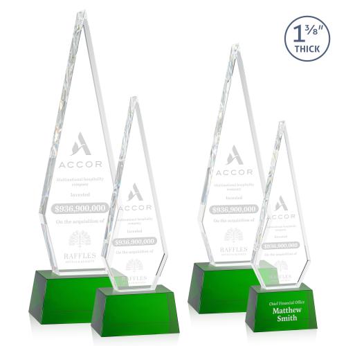 Exemplify success and honor remarkable achievements with the Cullen on Small Base Green Polygon Crystal Trophy. This Optical Crystal award encompasses elegance with its diamond-shape design atop a striking green base, providing a modern twist to the classic elements of recognition. Standing regally at an impressive 1 3/8 inch thickness, the trophy's precision-cut edges capture and reflect light, showcasing its exceptional clarity and the superb craftsmanship behind this stunning piece. The option for 2nd position etching caters to tailored inscriptions, making each award uniquely significant. Ideal for corporate recognitions, this trophy symbolizes the pinnacle of excellence and victory, an unforgettable token for any recipient.
