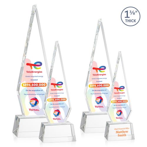Elevate your achievements with the Cullen Full Color on Small Base Clear Polygon Crystal Trophy-an epitome of elegance and recognition. Crafted from premium optical crystal, this stunning award boasts a distinctive elongated diamond shape, with a resolute 1 3/8 inch thickness that captivates attention. Clear and flawlessly cut to perfection, its polygonal design captures and reflects light, giving prominence to its exceptional clarity. The trophy's freestanding nature and ability to merge tradition with modernity make it a perfect adornment for any accolade. Personalize your honor with a burst of color through our VividPrint technology, allowing for a vibrant and meaningful commemoration on its ample surface. Matched with a solid base for stability, this award is not merely a token but a beacon of success that's truly deserving of display. Optional second position etching adds another dimension to this customizable token of prestige.