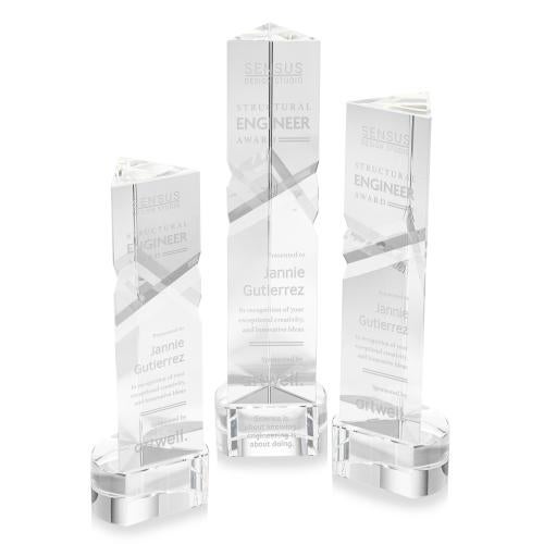 Celebrate outstanding achievements with the Groves on Half Round Base Clear Towers Crystal Trophy, a masterpiece of craftsmanship and elegance. This award features deep, interchanging facets that exquisitely catch and reflect light, adding a breathtaking sparkle to any recognition ceremony. Made from high-quality optical crystal, its distinctive triangular tower shape and impeccable clarity make it a standout piece, perfect for honoring exceptional accomplishments. The trophy sits elegantly on a half-round base, with optional personalization available to make each award truly unique. Ideal for corporate events or special occasions, this crystal tower is a timeless symbol of success and excellence.