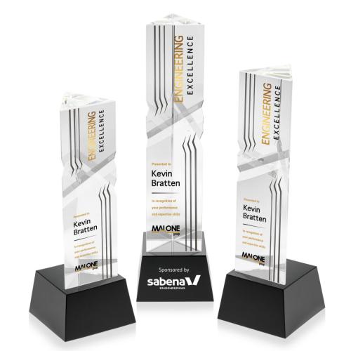 The Groves Full Color on Small Base Black Towers Crystal Trophy is an exquisite choice for honoring exceptional achievements with elegance and style. Crafted from top-tier optical crystal, this award features a unique design with deep facets that beautifully catch and reflect light, enhancing its visual appeal. Its striking triangular shape and flawless clarity make it a distinctive piece for any award ceremony or display. Personalize it with full-color VividPrint to transform your artwork into a vibrant masterpiece. With an optional second-position decoration on the base, this trophy provides a sophisticated and customizable way to celebrate excellence and success. Ideal for recognizing milestones, it offers a blend of modern aesthetics and timeless craftsmanship.