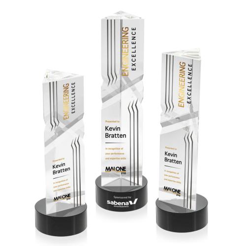 Celebrate exceptional achievements with the stunning Groves Full Color on Lockwood Base Black Towers Crystal Trophy. Crafted from premium optical crystal, this award captivates with its deep, interchanging facets that beautifully catch and reflect light. Its distinctive triangular tower shape not only adds sophistication but also ensures it stands out at any event. The base provides an optional second-position decoration, allowing for personalized touches. Elevate any recognition ceremony with full-color VividPrint, turning your artwork into a vibrant display. This elegant trophy is a perfect blend of artistry and elegance, ideal for honoring milestones in style.