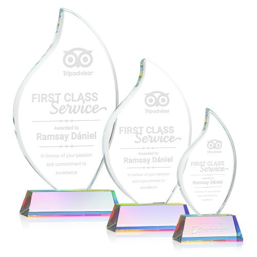Introducing the Teague on Helton Prismatic Flame Crystal Trophy, a stunning piece designed to celebrate exceptional achievements with elegance and style. Crafted from 3/4" thick Starfire Crystal, this exquisite flame-shaped award features beautifully rounded edges, symbolizing passion and excellence. It stands proudly on a tall, tapered Optical Crystal prismatic Newhaven Base, adding a touch of sophistication and sparkle that captures light beautifully. Perfect for commemorating momentous events, this trophy arrives in a luxurious black satin-lined presentation gift box. Personalize with optional second position etching and color fill to make it truly unique. Ideal for those seeking to honor greatness with a meaningful and lasting tribute.