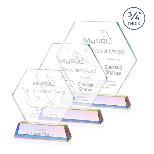 Celebrate exceptional achievements with the Colvin Prismatic Polygon Crystal Trophy. This sophisticated award, crafted from premium optical crystal, features a striking hexagonal design that captures light beautifully. It rests on a tall, tapered base available in your choice of nine vibrant colors, adding a personalized touch to each award. The spacious surface allows for your accomplishments to be permanently deep-etched by hand, commemorating your achievements with elegance. Optional second-position etching and color-fill enhance the distinction of this trophy, making it a memorable piece for honoring excellence. Ideal for corporate recognition, this masterpiece will leave a lasting impression.