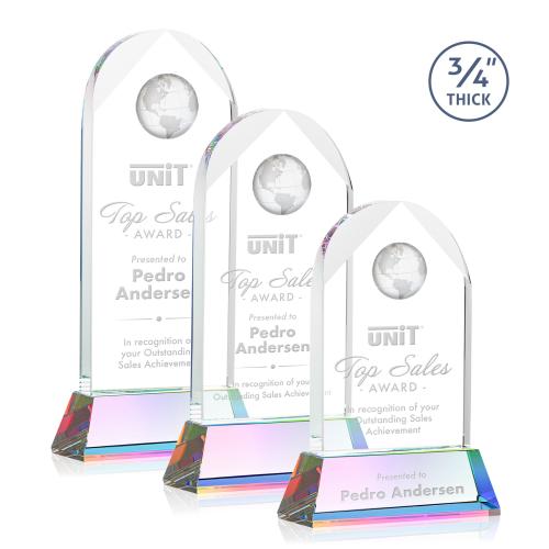 Celebrate exceptional achievements with the stunning Cortez Globe on Helton - Prismatic award. This exquisite piece features a gleaming Starfire Crystal arch, accentuated by a beautifully detailed Optical Crystal Globe that symbolizes global recognition. Perched atop a tall, tapered base available in nine vibrant colors, this award offers a dazzling show of accomplishment. Its elegant design with beveled peaks adds a touch of sophistication, making it an ideal choice for honoring outstanding performance. The possibility of second position etching and color fill allows for personalized touches, ensuring your award is as unique as the achievement it commemorates. Perfect for making any occasion memorable, this award is a true testament to success.