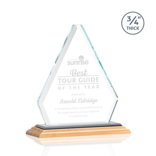 Introducing the Mayer Bamboo/Black Diamond Wood Trophy, a sophisticated and elegant choice for honoring exceptional accomplishments. This distinguished award combines natural wood and clear crystal to create a striking diamond silhouette that captures and reflects light brilliantly. The deep bevels on the crystal frame your personalized message with an exquisite touch, while the sturdy mitered base adds an extra layer of elegance and stability. Available with your choice of eleven unique base styles, this trophy is perfect for any corporate event or special recognition ceremony. Celebrate excellence with a trophy that is as remarkable as the achievements it commemorates.