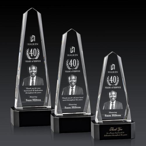 Introducing the Geneva 3D on Base Black Obelisk Crystal Trophy-a stunning tribute to achievement. Crafted from exquisite optical crystal, this obelisk-shaped award captivates with its dynamic interchanging bevels that catch and reflect light, symbolizing the multifaceted nature of success. The award is mounted on a robust optical base available in clear, emerald, sapphire, or ebony, adding an elegant touch to its majestic appearance. Enhance its grandeur with our remarkable Dimensions 3D Engraving, providing deep etching that personalizes the trophy beautifully. Ideal for commemorating special milestones, this award is a perfect blend of sophistication and recognition.