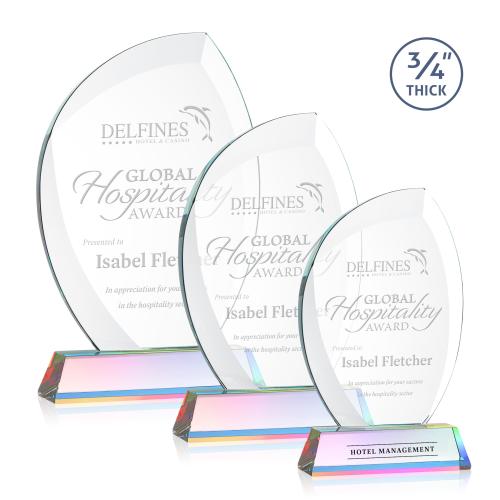 Celebrate remarkable achievements with the Oakes on Helton Base Prismatic Flame Crystal Trophy. Crafted from thick 3/4" Starfire Crystal, this award features sweeping bevels that beautifully frame your custom message, catching the light in a dazzling display. Resting on an elegant, tapered optic crystal base available in nine vibrant colors, this trophy stands as a modern tribute to success. Its striking flame design symbolizes passion and dedication, making it a perfect choice for honoring exceptional accomplishments. Optional second position etching and colorfill allow for personalized touches, ensuring each award is as unique as the achievement it represents.