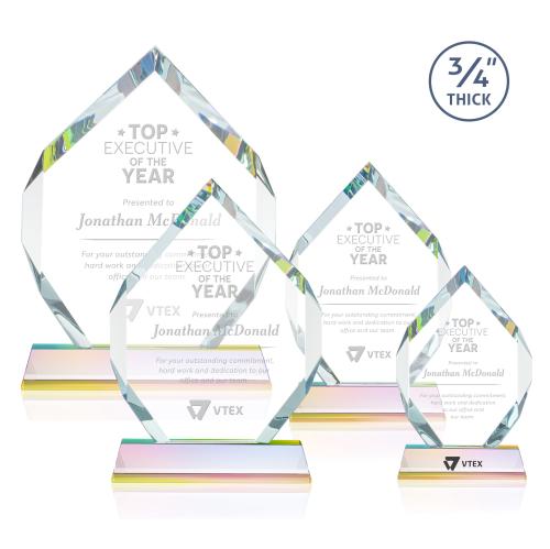 The Diamond Diamond on Helton Prismatic Polygon Crystal Trophy is the perfect choice for honoring exceptional achievements with elegance and sophistication. Crafted from pristine Starfire crystal, this award features a symmetrical, six-sided design with constant-width bevels that create stunning reflections and a captivating sparkle. The broad, polished edges beautifully frame the central etching area, offering a perfect canvas for personalized messages or logos. This impressive piece is mounted on a tall, tapered, prismatic optical crystal base, adding a touch of grandeur to the presentation. Optional second position etching and colorfill allow further customization, ensuring this trophy meets your unique recognition needs. Ideal for corporate awards, this trophy is a testament to excellence and a cherished memento for any recipient.