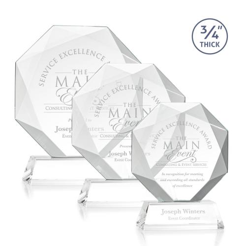 Celebrate extraordinary achievements with the Gregory on Helton Base Starfire Polygon Crystal Trophy, an exquisite symbol of success and recognition. This striking 0.75" thick octagonal award features multifaceted recessed bevels that create a captivating diamond-like design, perfect for honoring remarkable accomplishments. Crafted from premium Starfire Crystal, it stands elegantly on a tall, tapered optical base, available in nine vibrant colors to match any style or theme. With optional second position etch and colorfill, this customizable trophy offers a personalized touch to showcase any prestigious accolade. This award is an ideal choice for those looking to make a lasting impression with a sophisticated and stunning recognition piece.