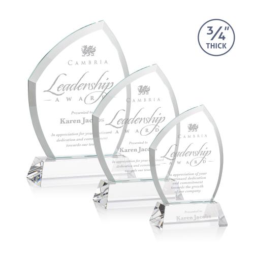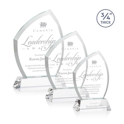 Celebrate outstanding achievements with the elegant Wilco on Helton Base Starfire Unique Crystal Trophy. Crafted from high-quality Starfire Crystal, this award features a stunning curved beveled frame that exudes sophistication and grace. Its 3/4" thickness ensures durability while proudly displaying any custom message or design. The trophy is mounted on a choice of a clear or colored optical crystal base, providing a steady and stylish foundation. Ideal for corporate recognition, this trophy offers an optional second etching position for an added personal touch. Recognize excellence with this unique, beautifully designed crystal keepsake that leaves a lasting impression.