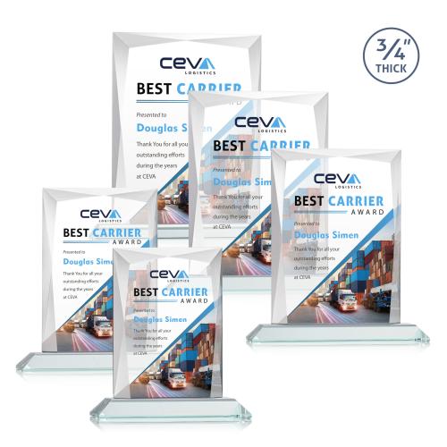 Commemorate exceptional achievements with the Cassidy Full Color Starfire Rectangle Crystal Trophy. This impressive award, crafted from 3/4-inch thick Starfire Crystal, features captivating interchanging bevels that beautifully refract light, creating a stunning display of brilliance. Mounted on a clear or colored base, this trophy serves as a timeless symbol of recognition. The full color VividPrint allows your personalized message to truly stand out, making it perfect for honoring noteworthy milestones. Ideal for celebrating excellence, this elegant trophy transforms a blank canvas into a cherished keepsake, capturing the essence of your special moments.