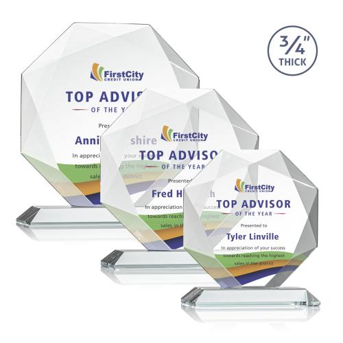 Recognize exceptional achievements with the Gregory Full Color Starfire Polygon Crystal Trophy-a breathtaking choice for acknowledging excellence. This award features a multifaceted octagonal design that creates stunning reflections, making it a true standout. Crafted from premium Starfire Crystal, it boasts a substantial 0.75" thickness and is mounted on a sophisticated mitered base, offering stability and elegance. The trophy provides the perfect canvas for your personalized message, brought to life in full-color VividPrint to ensure your recognition stands out. Ideal for corporate awards, this crystal trophy embodies prestige and gratitude, making it a cherished keepsake for any recipient.